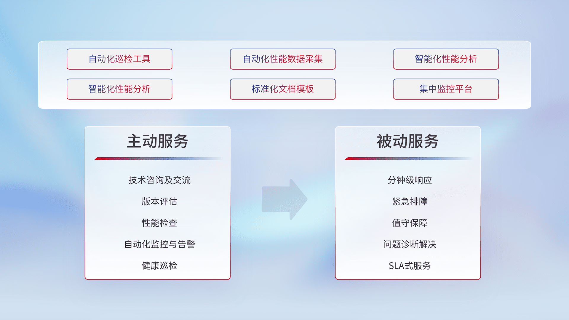智能化工具和标准化文档,,,,保障服务质量,,,提供主动服务(包含技术咨询、、版本评估、、、、性能检查、、自动化监控与告警、、、、健康巡检)和被动服务包含(分钟级响应、、紧急排障、、值守保障、、问题诊断解决、、、、SLA服务)。。。。